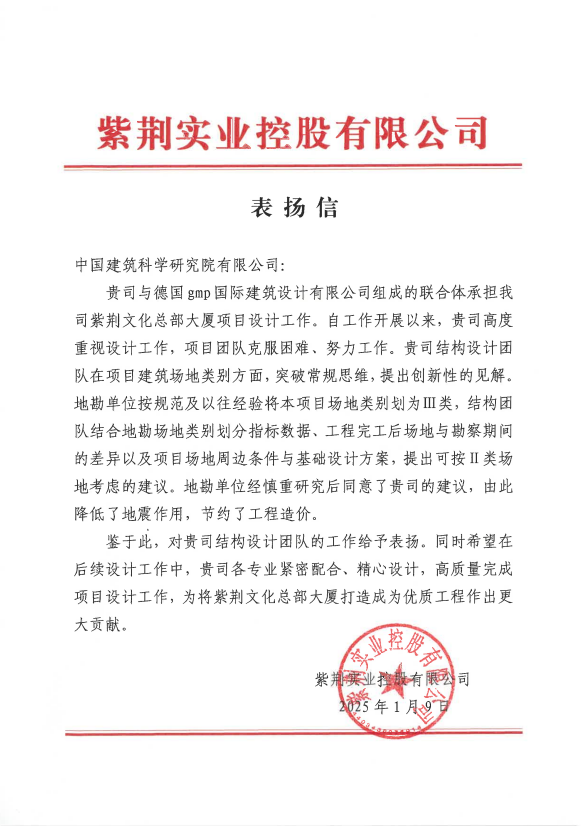 1月9日,中國建研院深圳分公司收到紫荊實業控股有限公司發來的表揚信,對中國建研院深圳分公司紫荊文化總部大廈項目設計團隊的工作給予充分肯定。