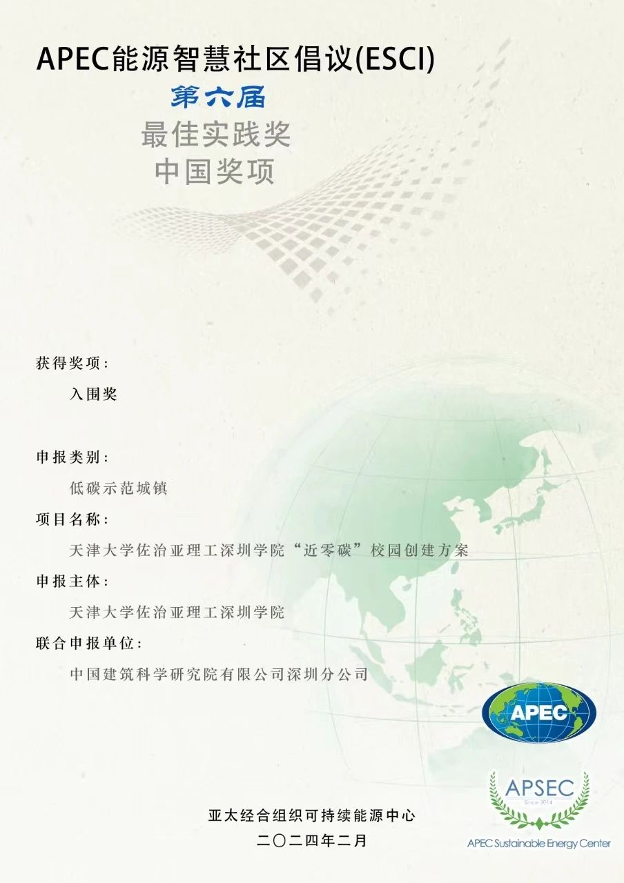 天津大學佐治亞理工深圳學院“近零碳”校園項目獲得第六屆APEC能源智慧社區倡議(ESCI)最佳實踐獎中國獎項“入圍獎”