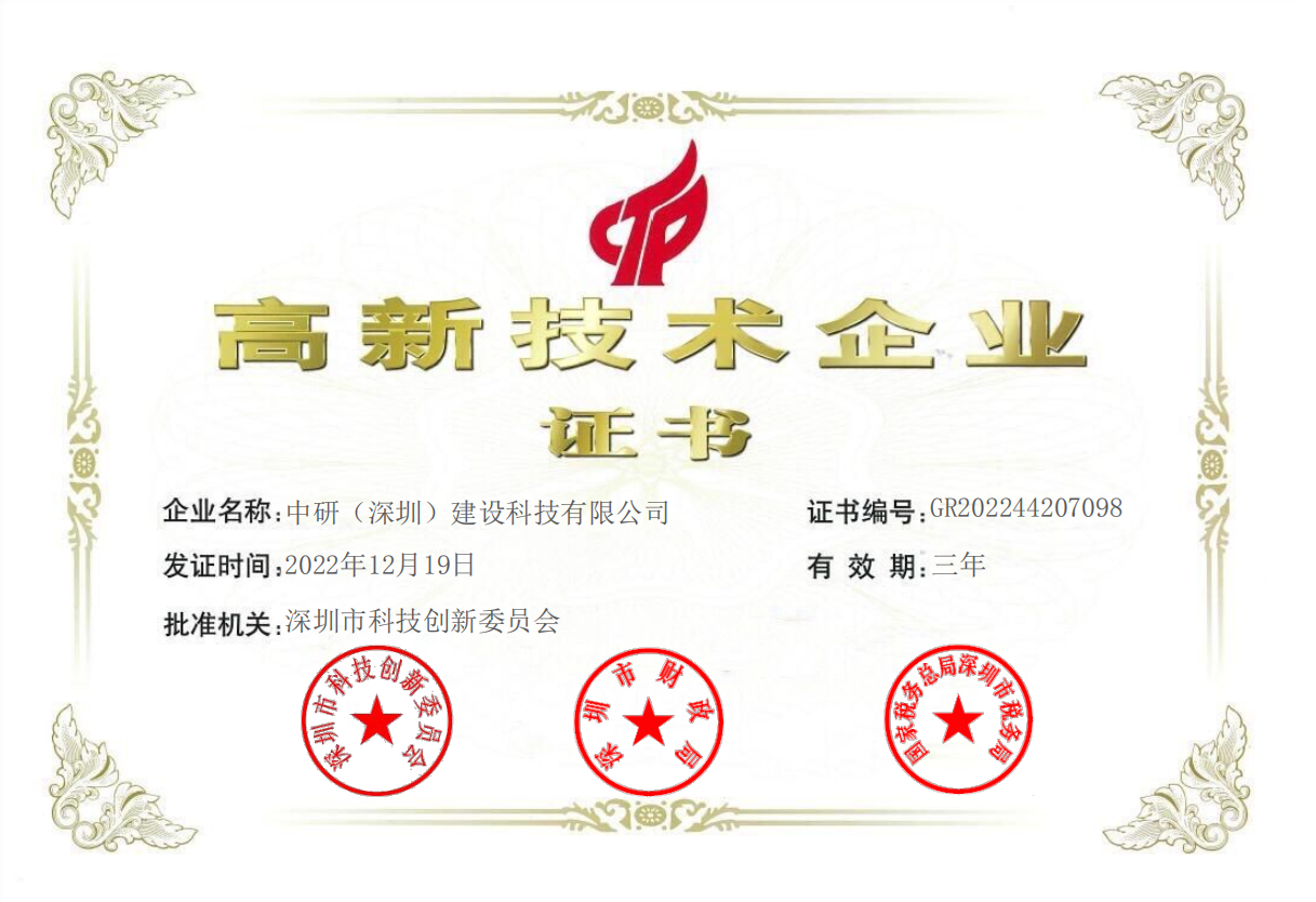 中研(深圳)建設(shè)科技有限公司榮獲國家級高新技術(shù)企業(yè)認(rèn)定