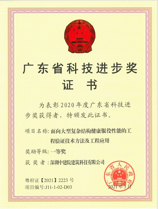 520日上午,廣東省科技創新大會在廣州召開,大會頒發了2020年度廣東省科學技術獎。深圳中建院建筑科技有限公司繼2018年之后,再度榮獲廣東省科學技術獎一等獎。獲獎項目《面向大型復雜結構健康服役性能的工程驗證技術方法及工程應用》,是以哈爾濱工業大學(深圳)(下稱哈工大)滕軍教授團隊、深圳中建院建筑科技有限公司(下稱深圳中建院)何春凱研究員等作為主要參與人,哈工大、中建四局、深圳中建院共同完成的課題。