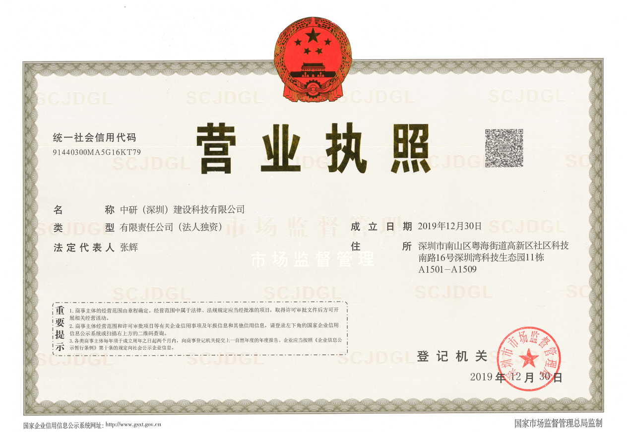 2019年,《粵港澳大灣區發展規劃綱要》及《中共中央國務院關于支持深圳建設中國特色社會主義先行示范區的意見》先后印發,深圳迎來了“雙區驅動”時代。為積極參與粵港澳大灣區建設,中國建研院適時調整發展戰略和工作部署,于今年9月啟動設立獨立法人公司事項,在2019年末順利完成注冊工作。中研(深圳)建設科技有限公司營業范圍為工程設計;城鄉規劃設計;風景園林設計;建筑裝飾裝修設計;工程咨詢;建設工程項目管理;建筑技術開發、技術轉讓、技術咨詢、技術服務;軟件研發與銷售;建筑材料及設備的開發與銷售。