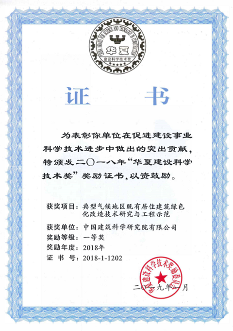 中國建筑科學(xué)研究院有限公司深圳分公司與上海市建筑科學(xué)研究院(集團)有限公司、哈爾濱工業(yè)大學(xué)共同完成的“十二五”國家科技支撐計劃課題《典型氣候地區(qū)既有居住建筑綠色化改造技術(shù)研究與工程示范》榮獲2018年華夏建設(shè)科學(xué)技術(shù)獎一等獎。