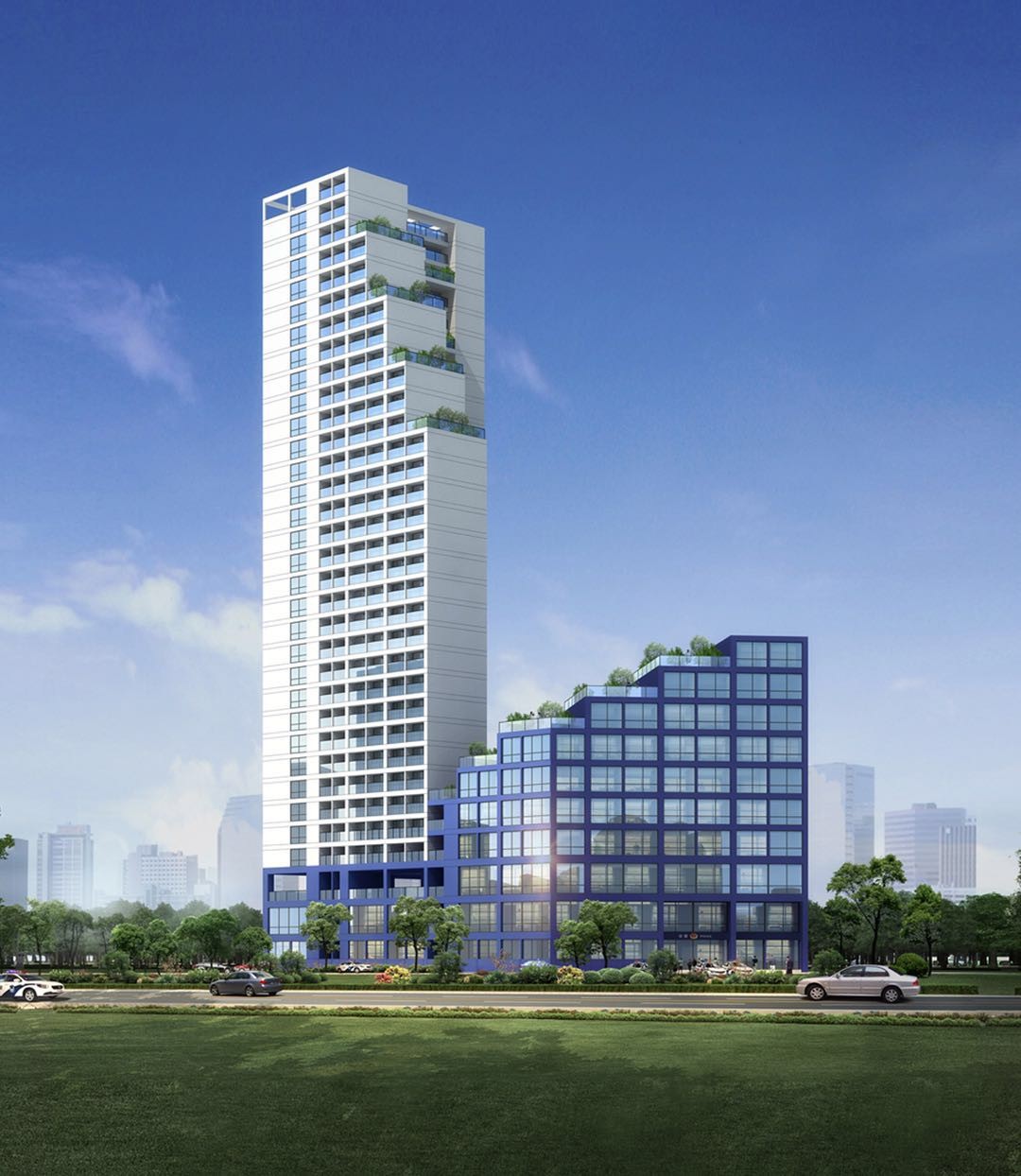 在建筑外觀設(shè)計(jì)上,方案以公安部門常用的藍(lán)作為主色調(diào),奠定簡潔務(wù)實(shí)的建筑外觀基調(diào),同時(shí)也將公安業(yè)務(wù)用房與生活配套用房以主色調(diào)區(qū)分開來。在造型上通過簡潔大方的建筑形式和退臺設(shè)計(jì),避免了刻板疏遠(yuǎn)的建筑形象,突出基層派出所親民、便民的工作風(fēng)格。契合了優(yōu)秀的建筑設(shè)計(jì)不僅追求使用的實(shí)用性,更應(yīng)追求適宜的建筑美感長久地服務(wù)于建筑功能的設(shè)計(jì)理念。
