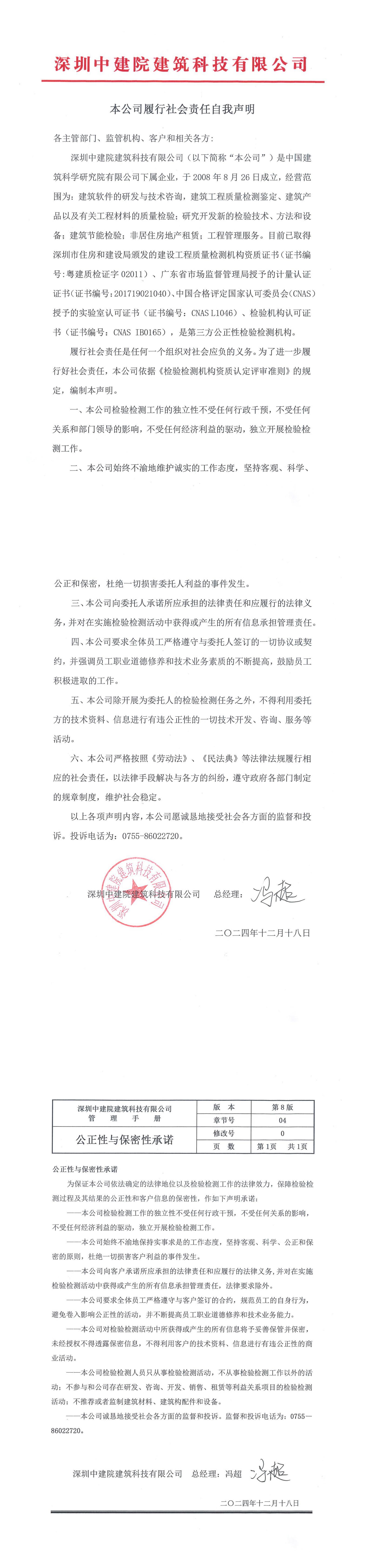 深圳中建院履行社會(huì)責(zé)任自我聲明、公正性與保密性承諾