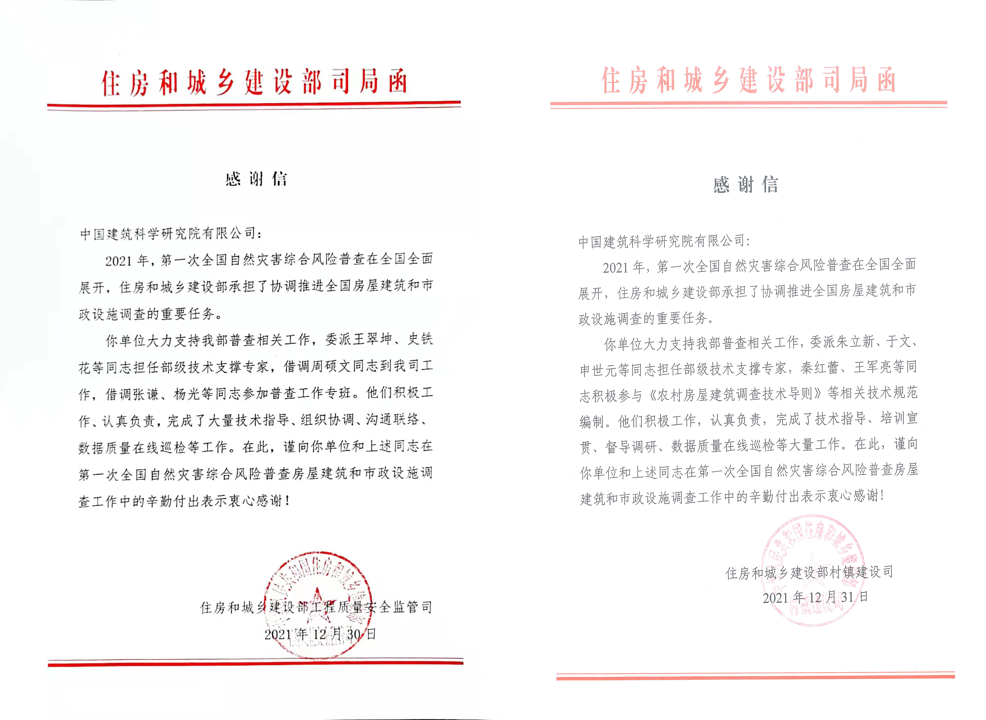 近日,中國建研院收到來自住房和城鄉建設部工程質量安全監管司、村鎮建設司發來的感謝信,并受到國務院第一次全國自然災害綜合風險普查領導小組辦公室表揚,對中國建研院在相關普查工作中的技術支持予以感謝。