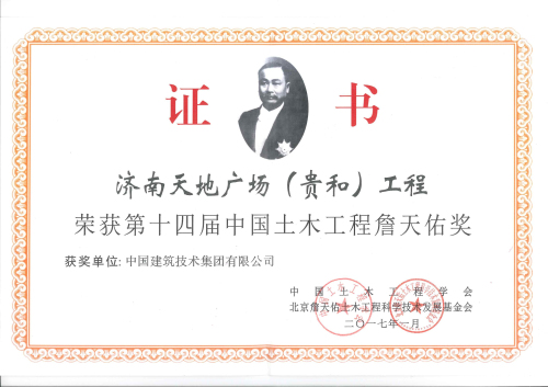 中技集團濟南天地廣場(貴和)項目榮獲“第十四屆中國土木工程詹天佑獎”